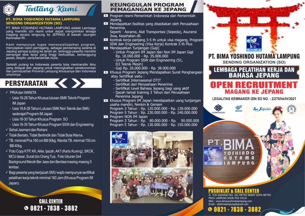 PT. Bima Yoshindo Hutama Lampung adalah Lembaga pelatihan kerja, yang mendidik serta memberangkatkan secara langsung para peserta magang kerja ke Jepang. PT. Bima Yoshindo Hutama Lampung telah memiliki izin resmi dari kemetrian ketenagakerjaan RI serta sudah SO (Sending Organization). SO (Sending Organization) adalah Lembaga pelatihan kerja yang sudah mendapatkan izin dari pemerintah dan bisa memberangkatkan peserta magang ke Jepang secara langsung.