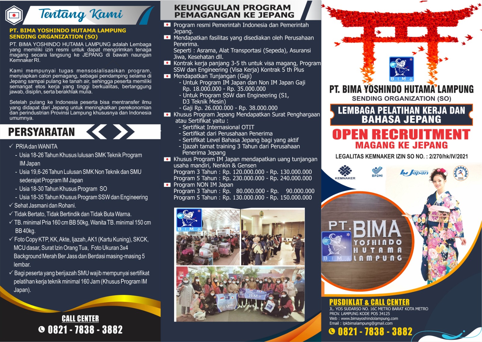 PT. Bima Yoshindo Hutama Lampung adalah Lembaga Pelatihan Kerja, yang mendidik serta memberangkatkan secara langsung para peserta magang kerja ke Jepang.